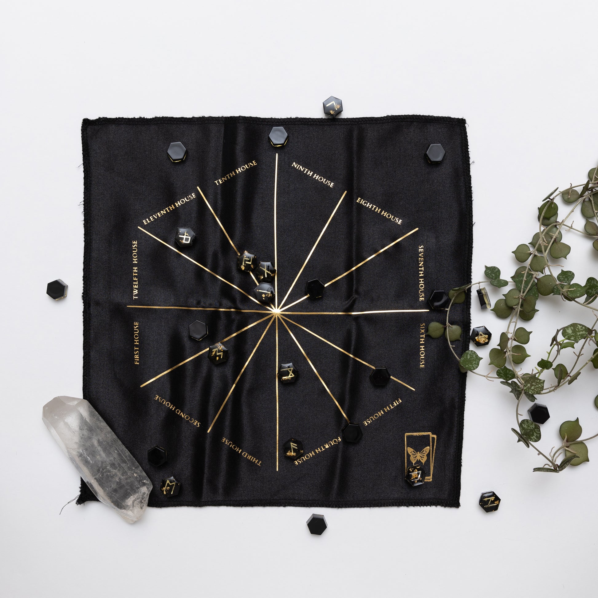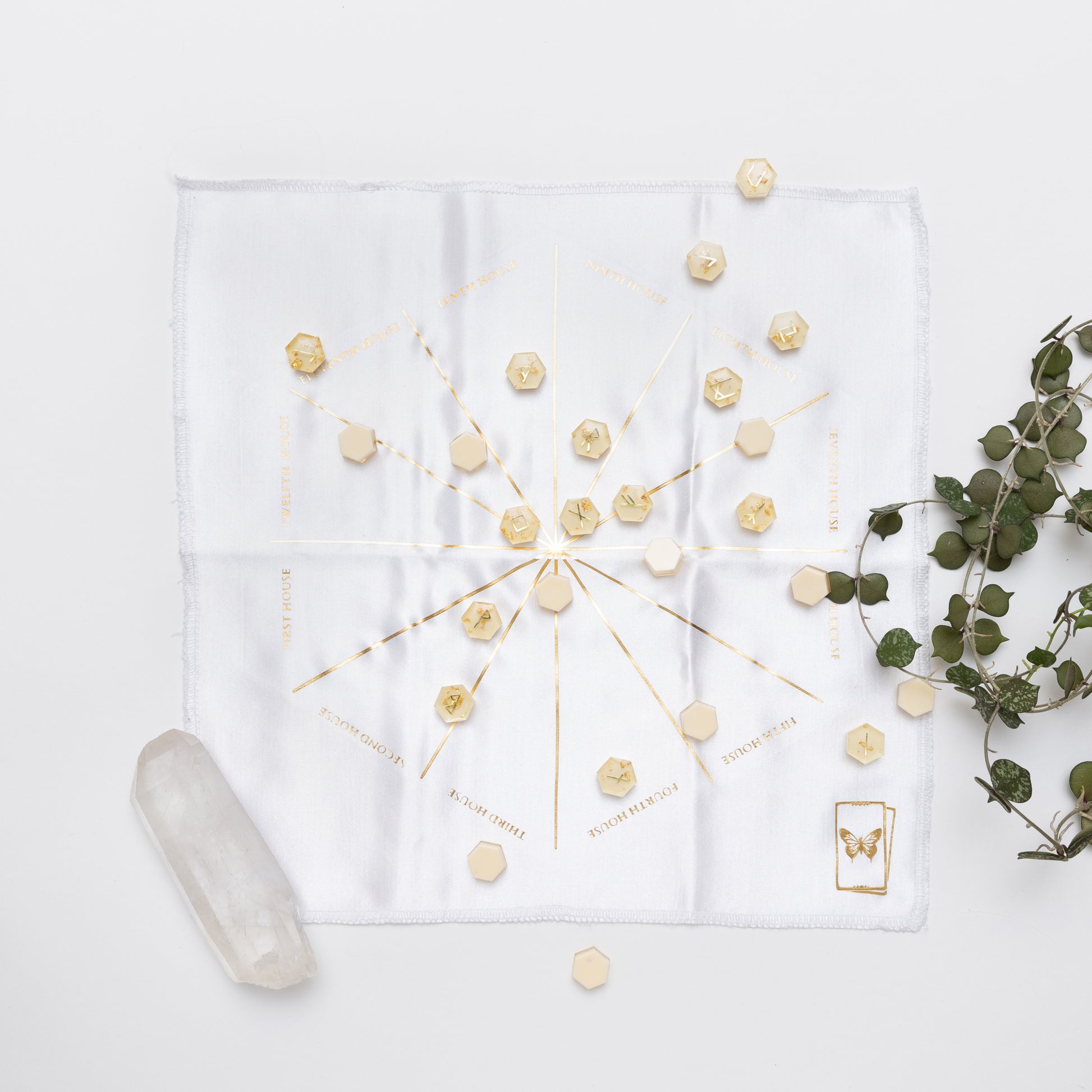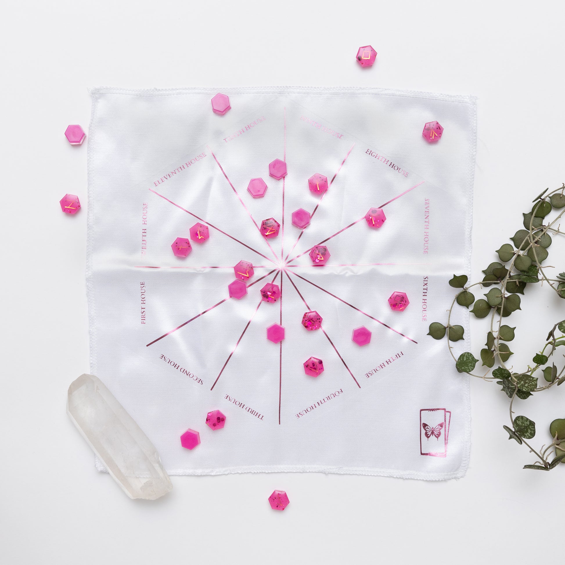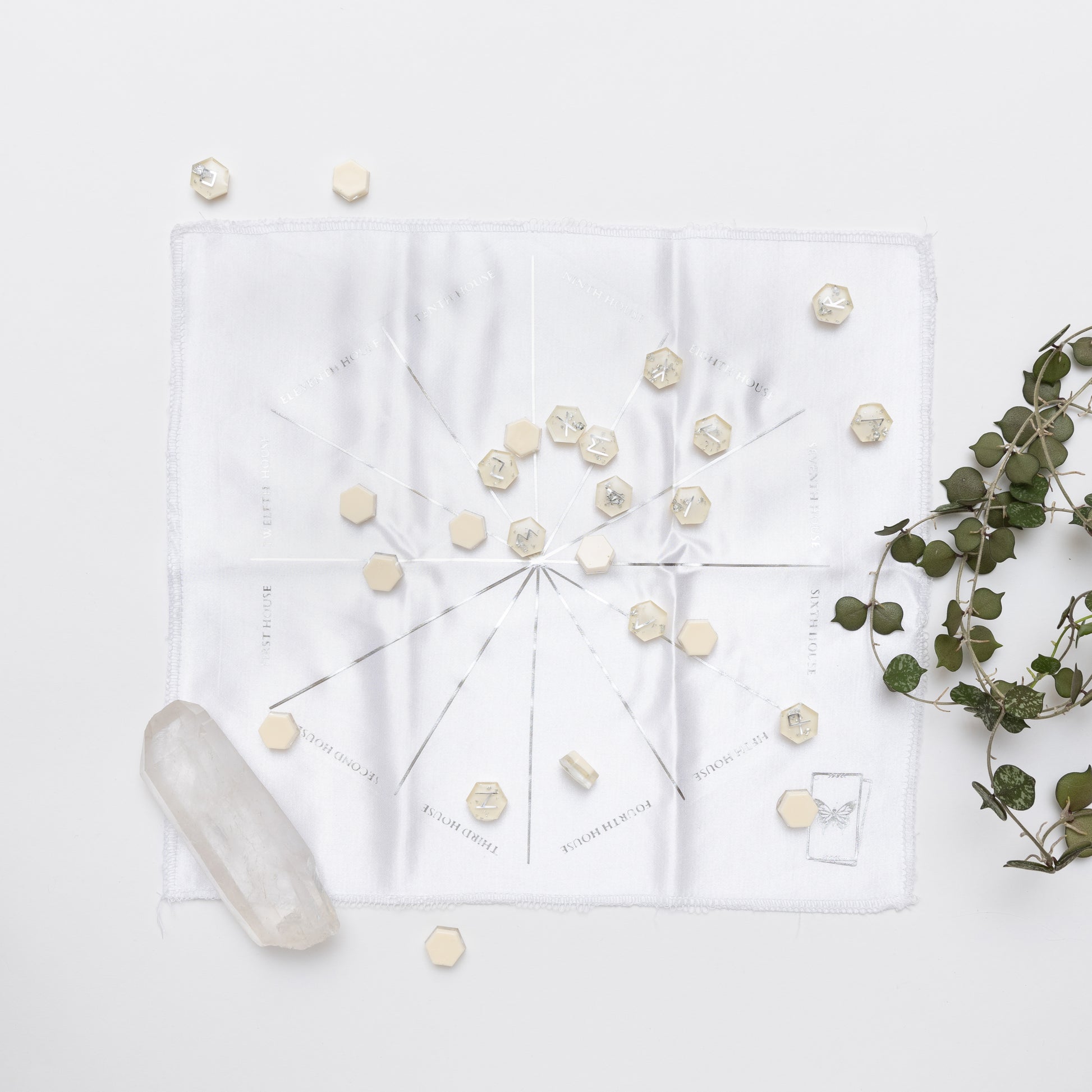 Casting onto cloth allows a greater depth of reading. Following the 12 Houses of Astrology, the cloth provides clarity regarding relationships (family, friends, lovers), inner journeys (healing, communication) and external endeavours (career, learning, creative pursuits).